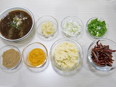 - Heat the pot and put palm sugar , red onion, onion, tamarind paste, paprika chili, and salt.